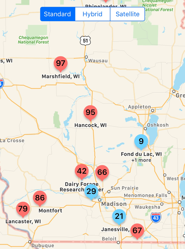 Figure 1 shows the calculated risk from Tarspotter for July 11, 2019, for various locations in Wisconsin. Figure 2 shows the risk for locations in southern and south-central Wisconsin. As you can see, the present risk remains generally high for tar spot development in all locations examined. However, risk percentages have dropped over the last week, for the most part. The continued elevated risk is due to the fact that the humidity was high over the last weekend, despite warmer temperatures. As temperatures climb and conditions remain dry, expect risk to decline. Tar spot is favored by persistent temperatures between 60 and 70 F and high relative humidity averaging above 75% for a 30-day period.