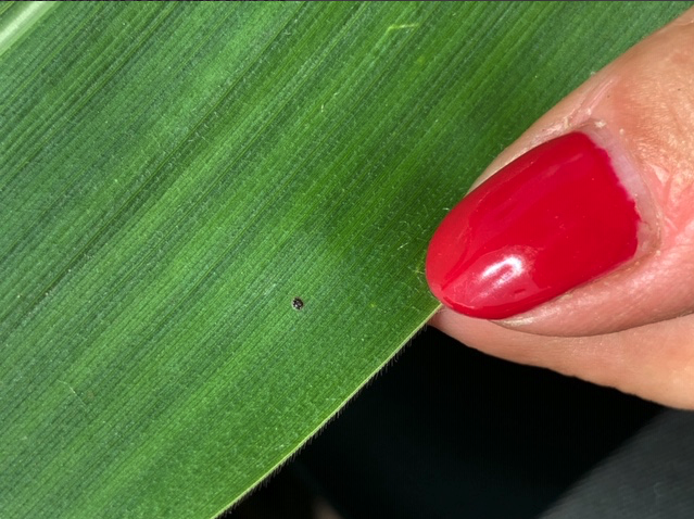 How can you tell if it is bug poop and not tar spot? Use a little spit or some water from a water bottle. Wet the leaf and lightly rub. Bug poop will come off, tar spot will not. In addition, tar spot spots will be raised and can be felt when you rub your finger across the black spot. Frass generally won’t feel like it is raised. Continue to scout and send samples. It is always better to get a confirmation, before you spray. If it is nothing to worry about, you can save the trip and the money!