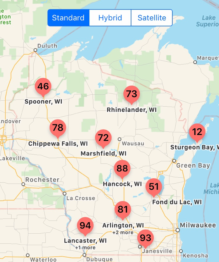 Figure 1. Sporecaster predictions for selected non-irrigated locations in Wisconsin for July 18, 2019.